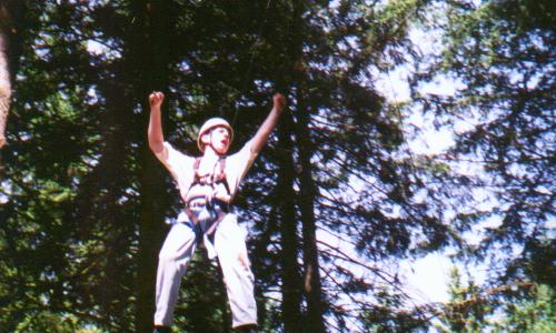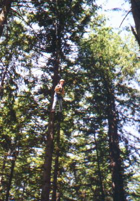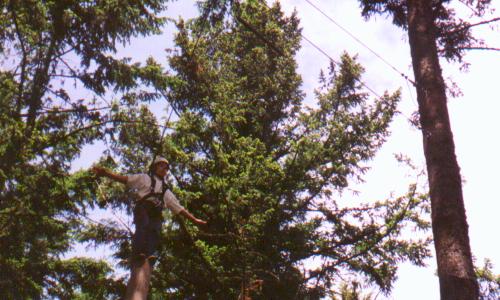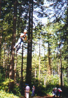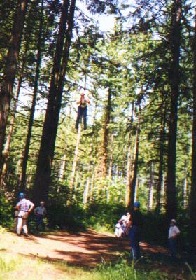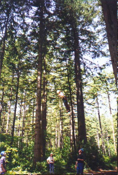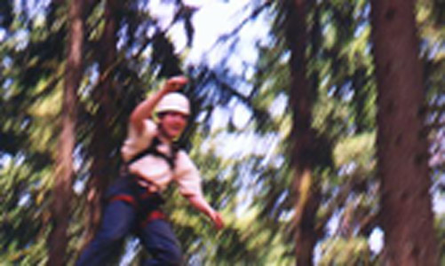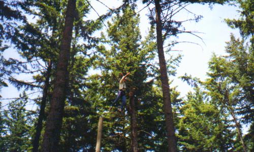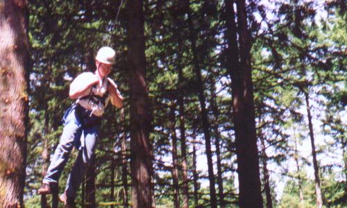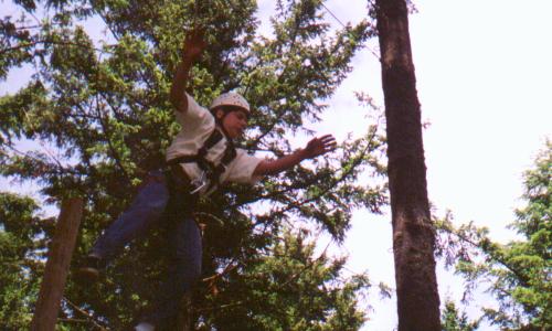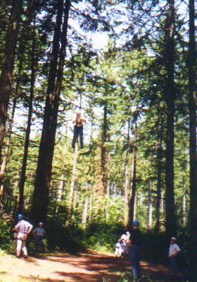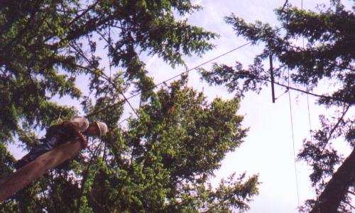 Climb the side of a tree, work your way through the ropes, swing